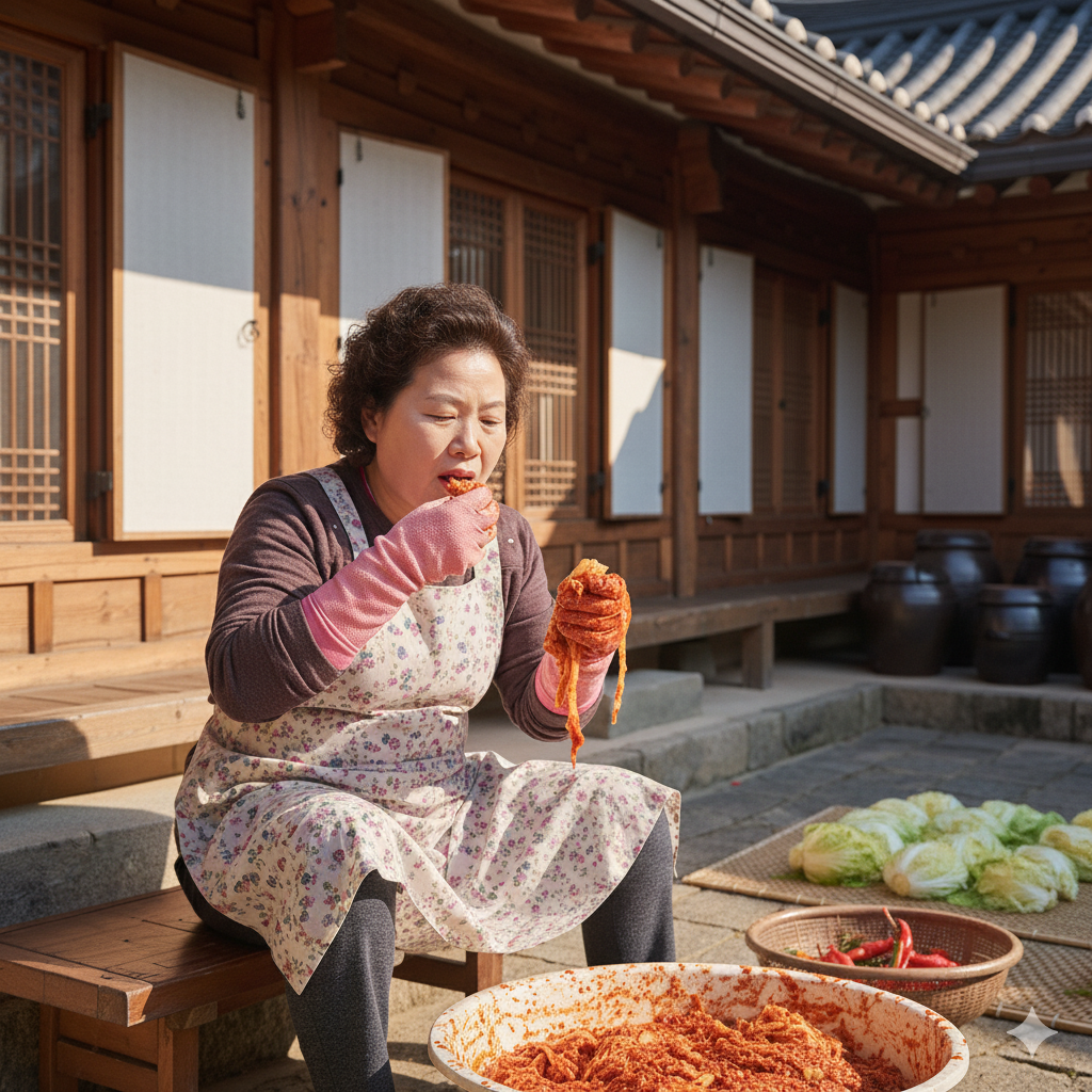 - 간 보기: 버무린 김치 한 조각을 잘라 최종 간을 확인합니다.